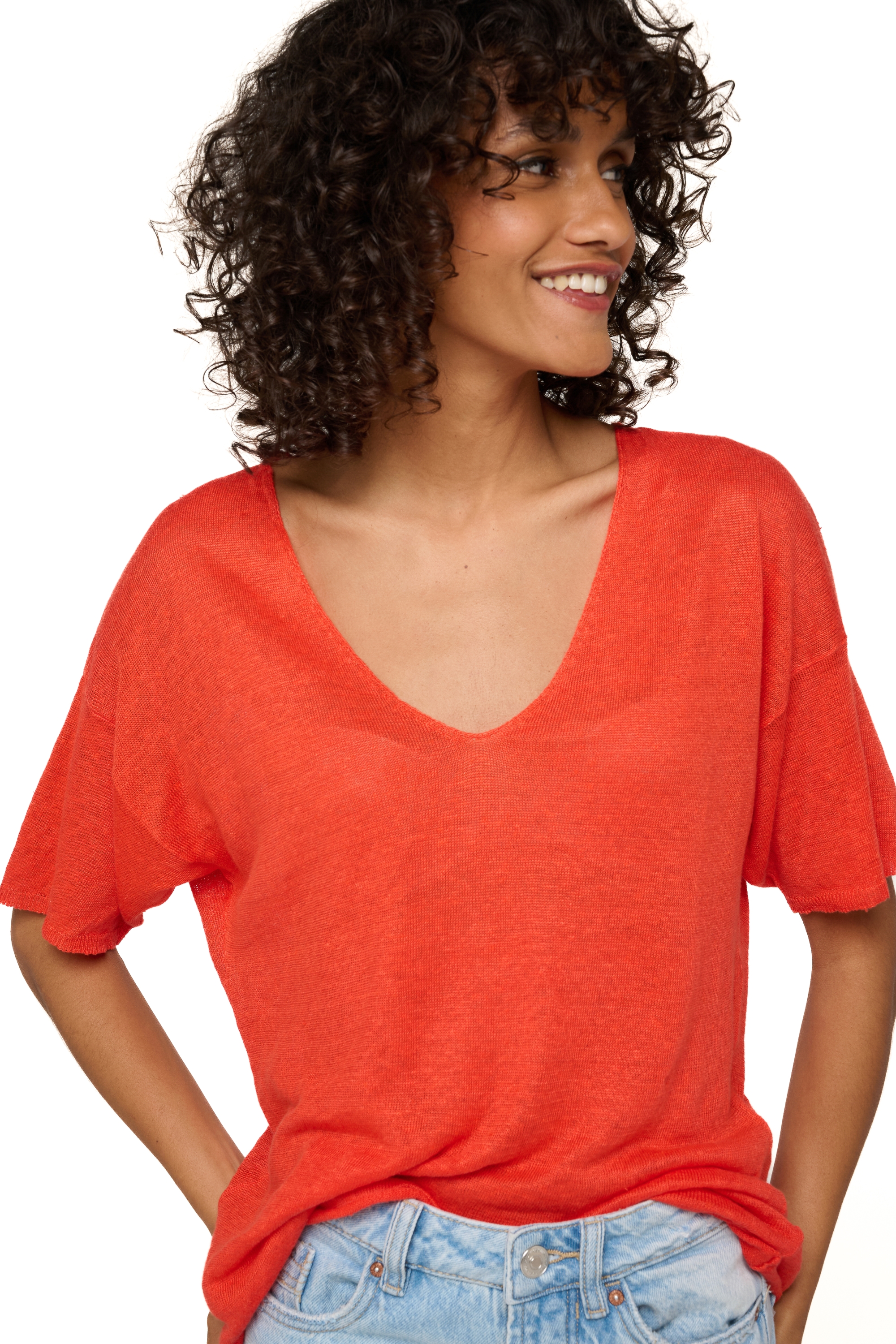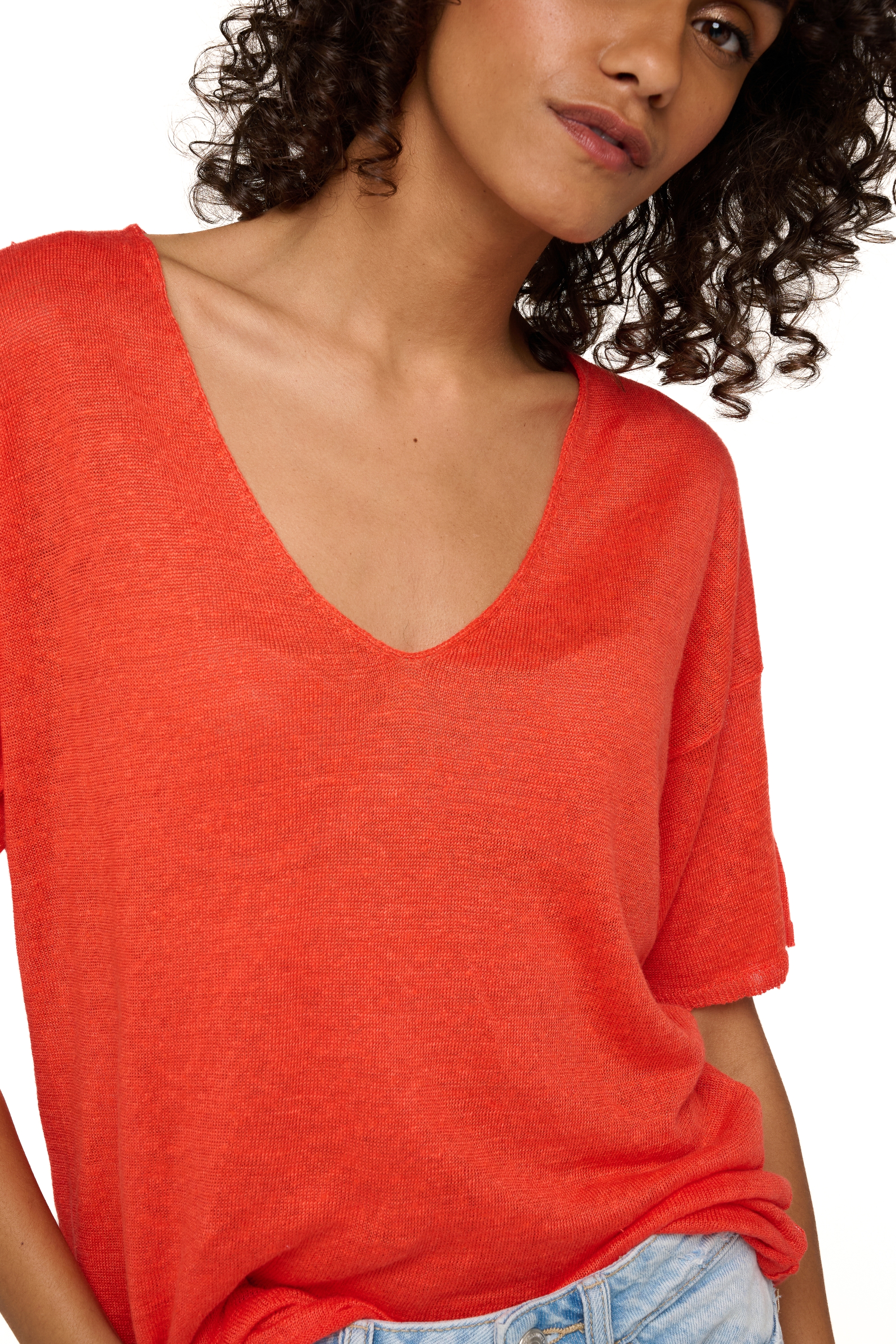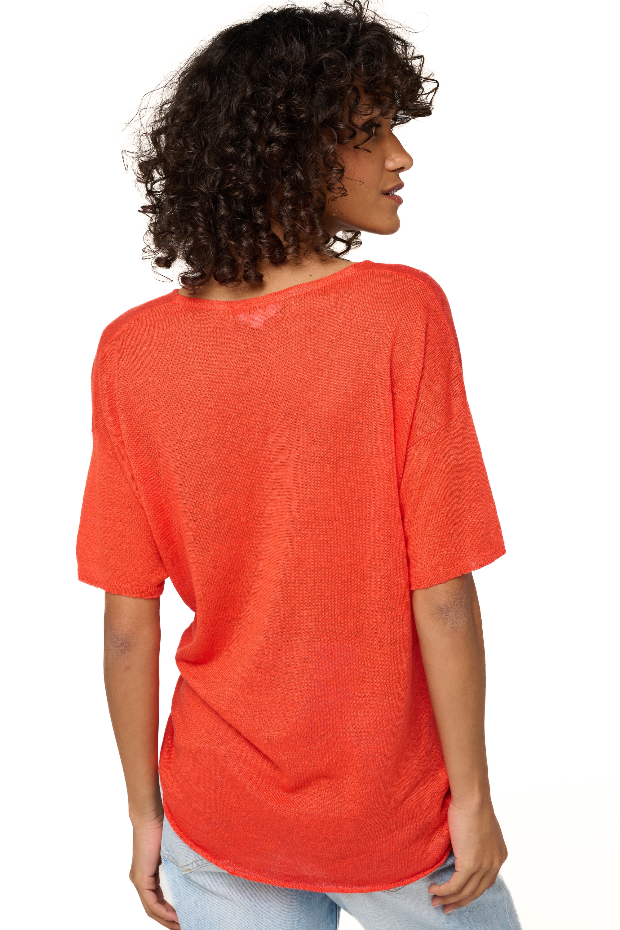 T-shirt con scollo a V lavorata in lino lavorato. Un capo che non può mancare per le belle giornate. La vestibilità leggermente loose la rende comodissima da indossare, direttamente a contatto con la pelle o sopra una canotta; un capo base... con stile da vendere. Interamente lavorata, la nostra collezione lino unisce eleganza e stile casual e propone capi delicati da indossare tutti i giorni.