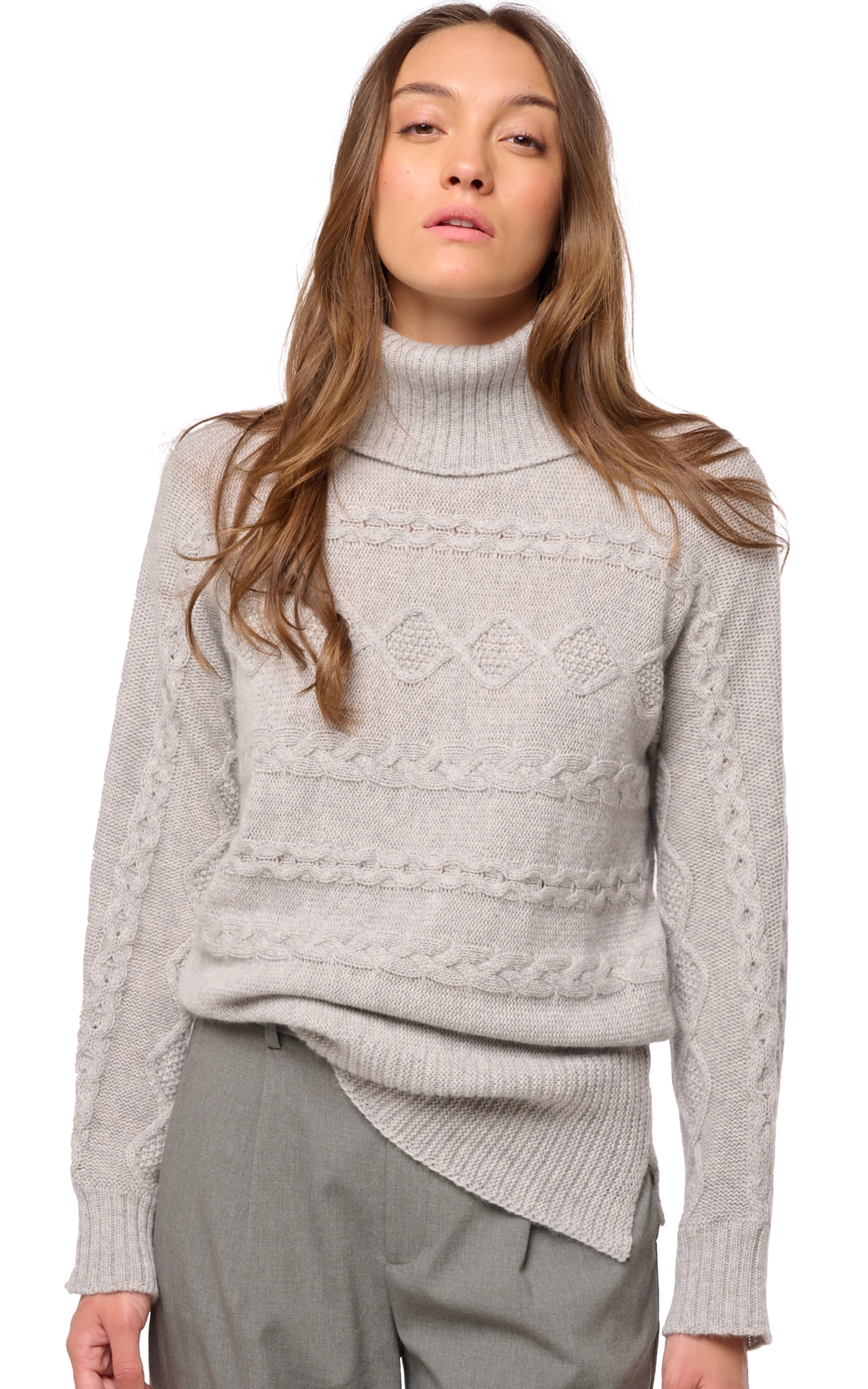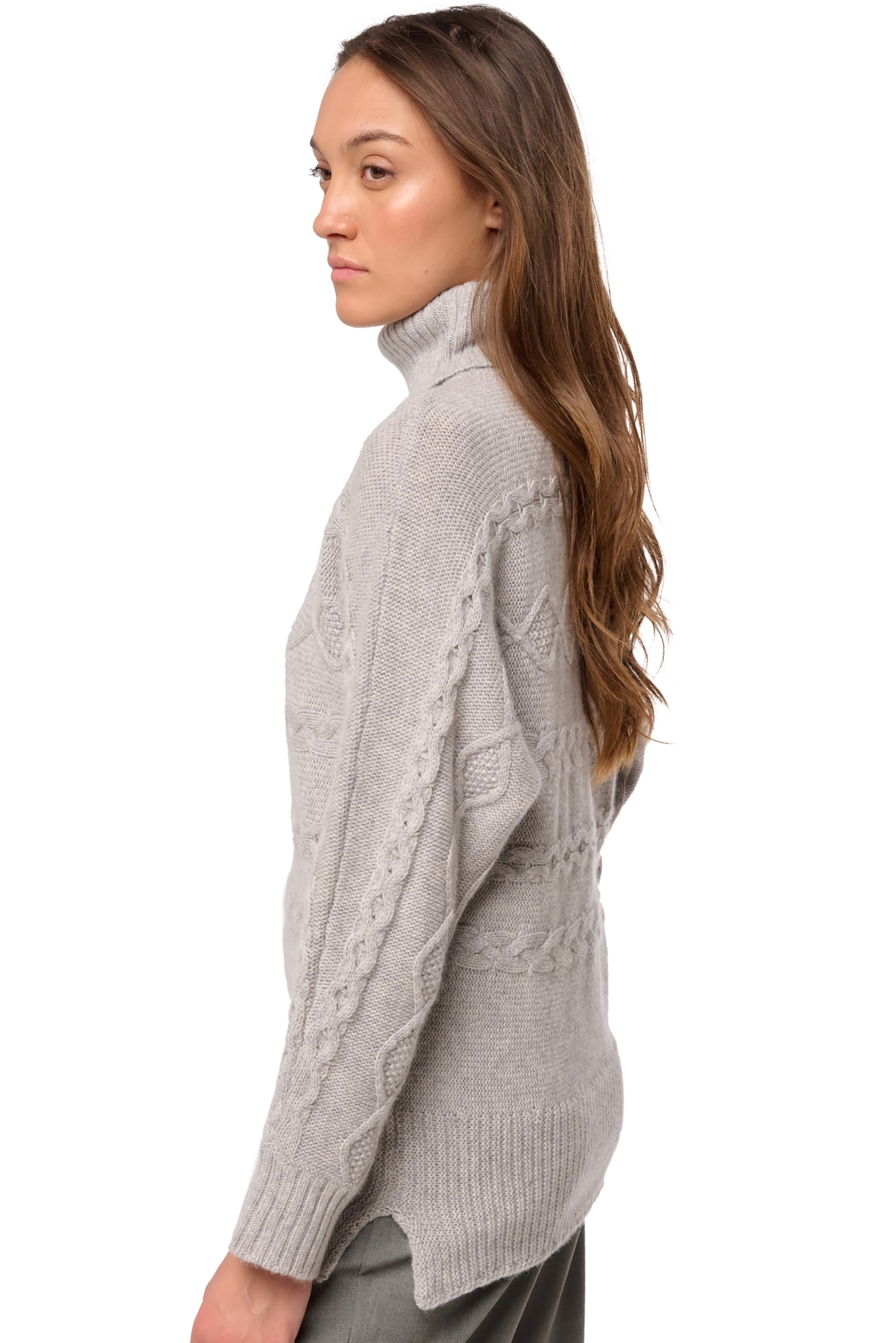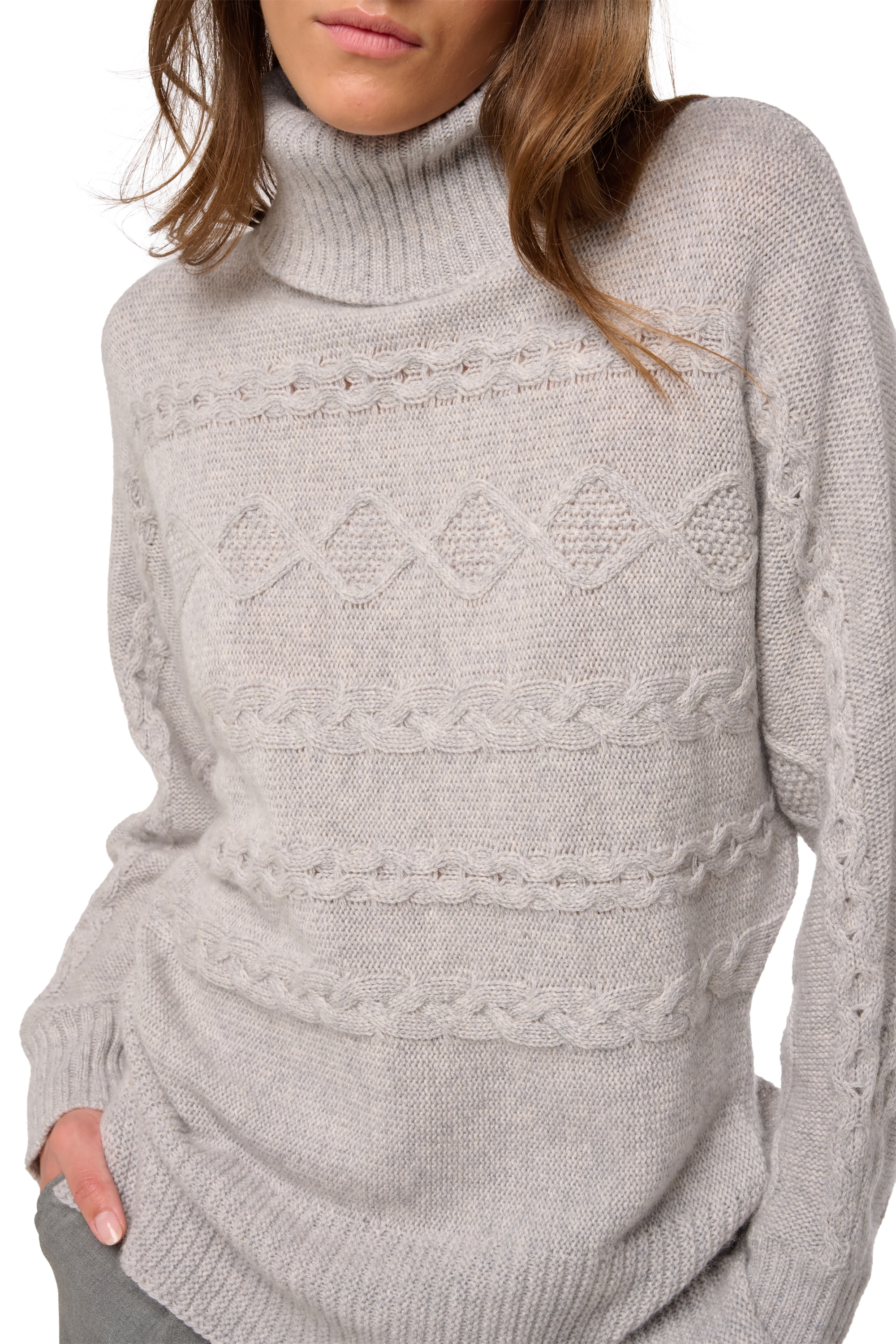 Dolcevita con maniche a pipistrello e trecce laterali. Bellissimo con il suo taglio alla moda e la sua lavorazione, è un vero maglione invernale da indossare sulle piste da sci ma anche in ufficio!